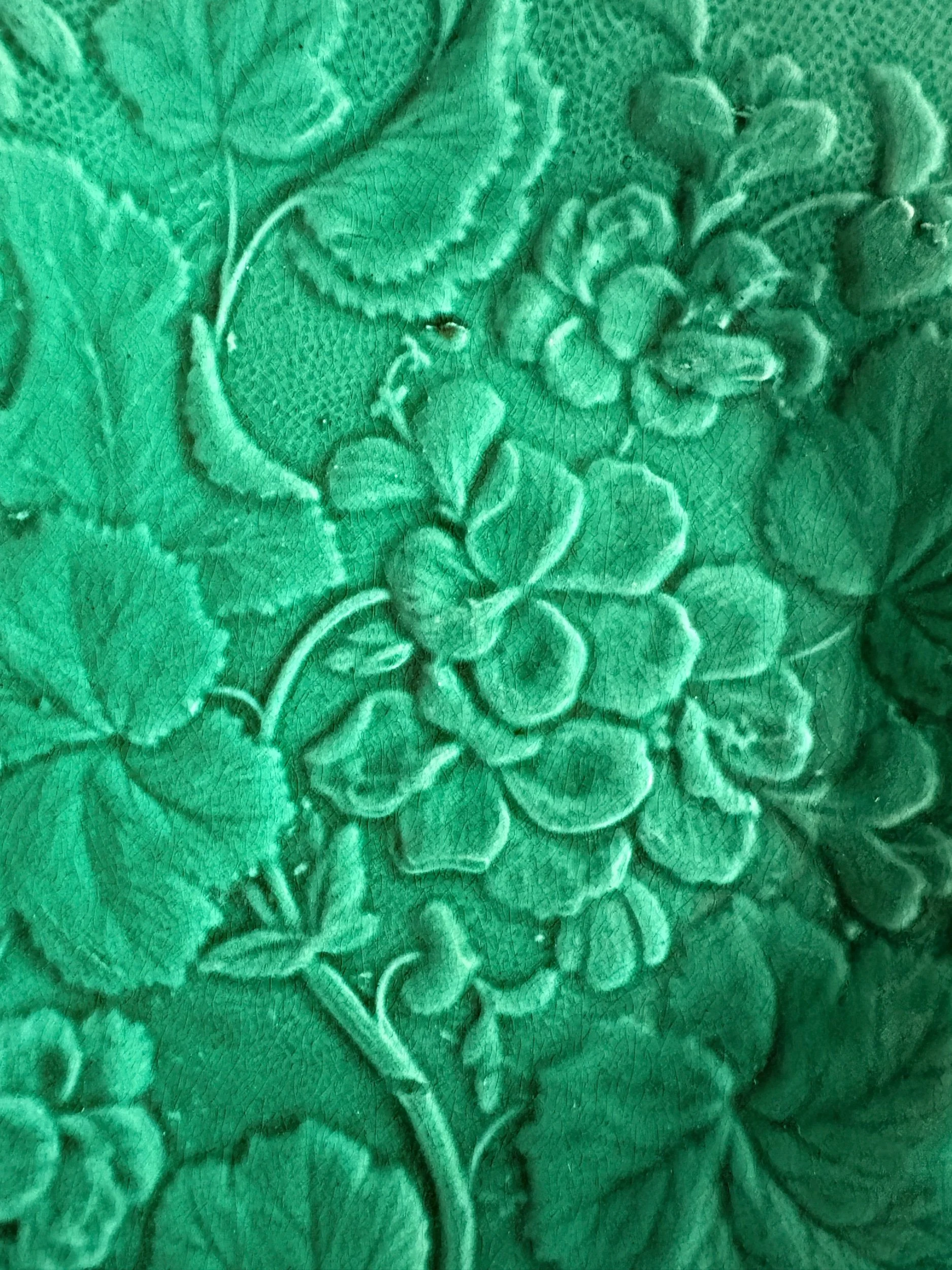 Shop Stuff › Antique maiolica plate Image 1 of 3 Image 2 of 3 Image 3 of 3 Antique maiolica plate £38.00 Antique maiolica plate with a decoration of moulded geraniums. (We have a comport for sale in the same design.)23cm across Add To Cart Added! Antique maiolica plate with a decoration of moulded geraniums. (We have a comport for sale in the same design.)23cm across
