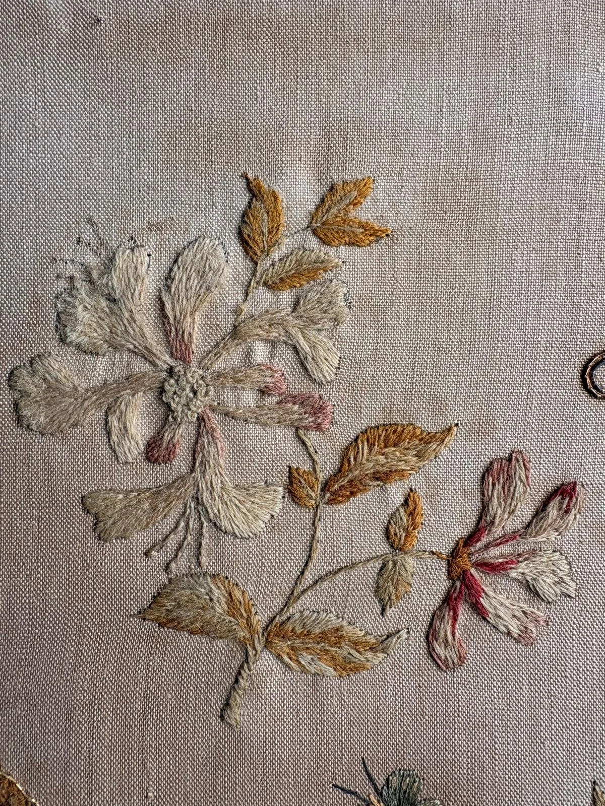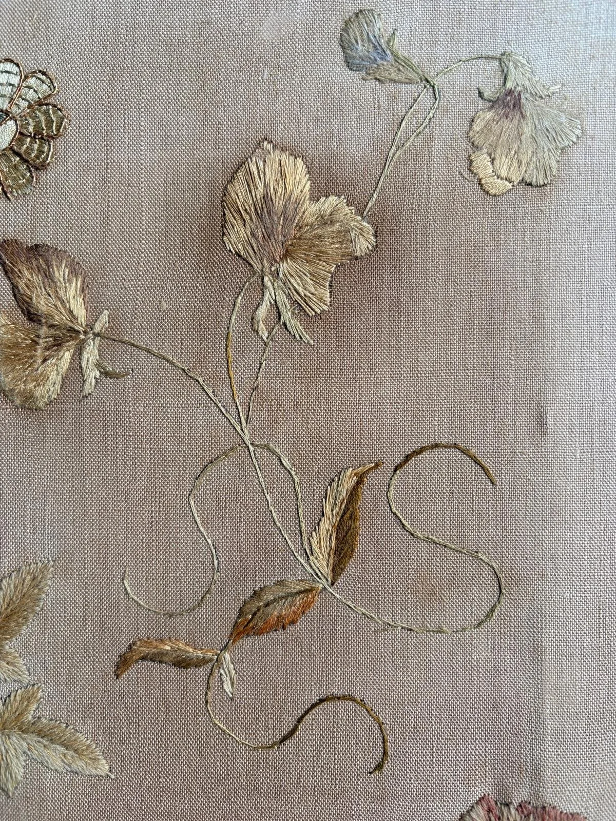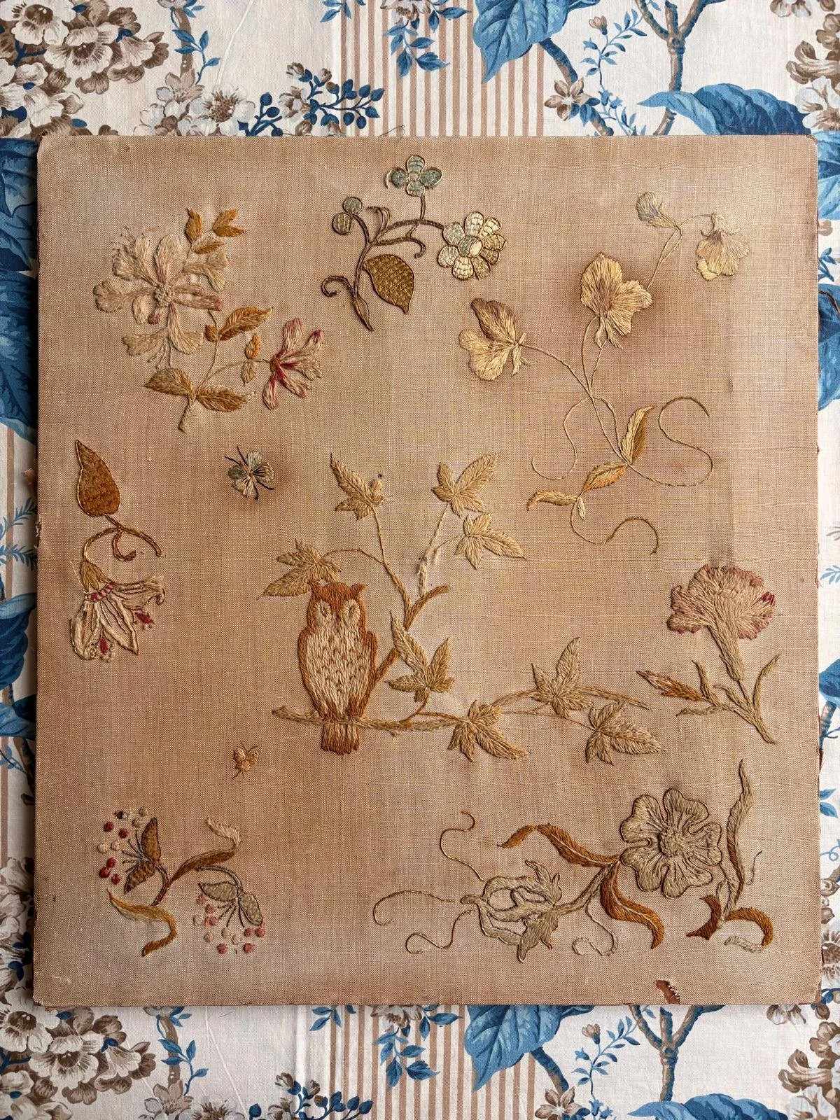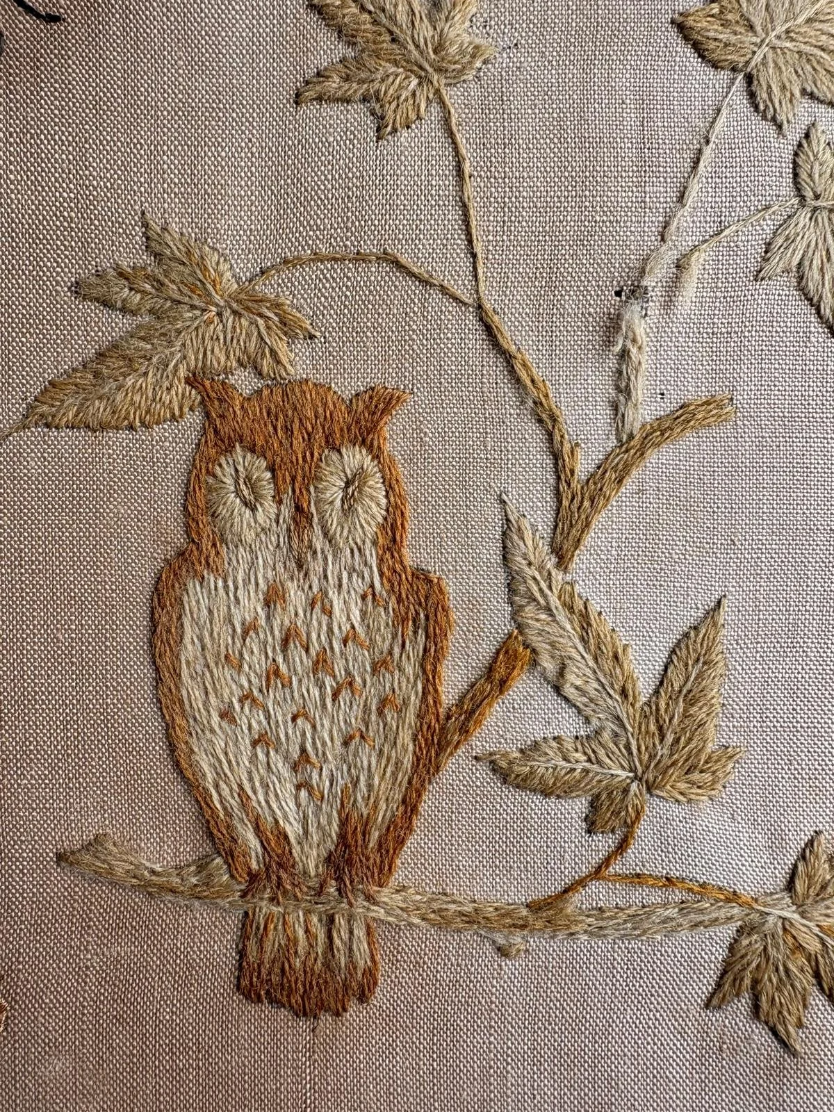 Delightful antique embroidery on linen featuring an owl and probably taken out of a wooden fire screen. Some small holes, as shown, and very scruffy backing