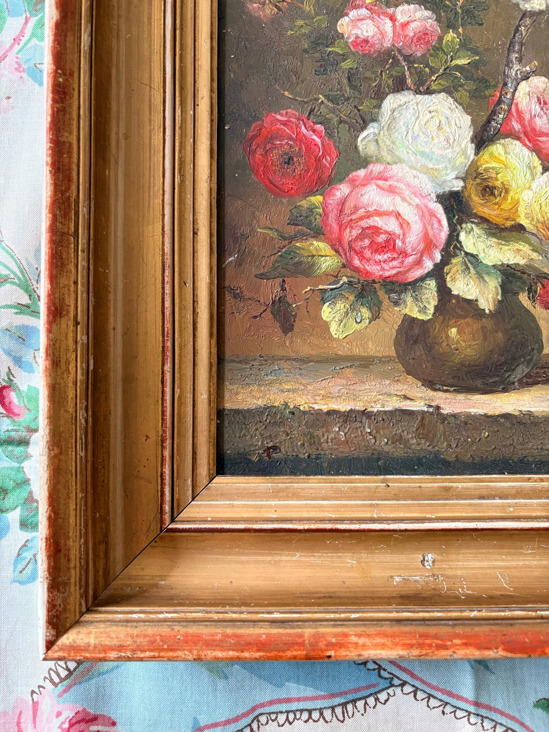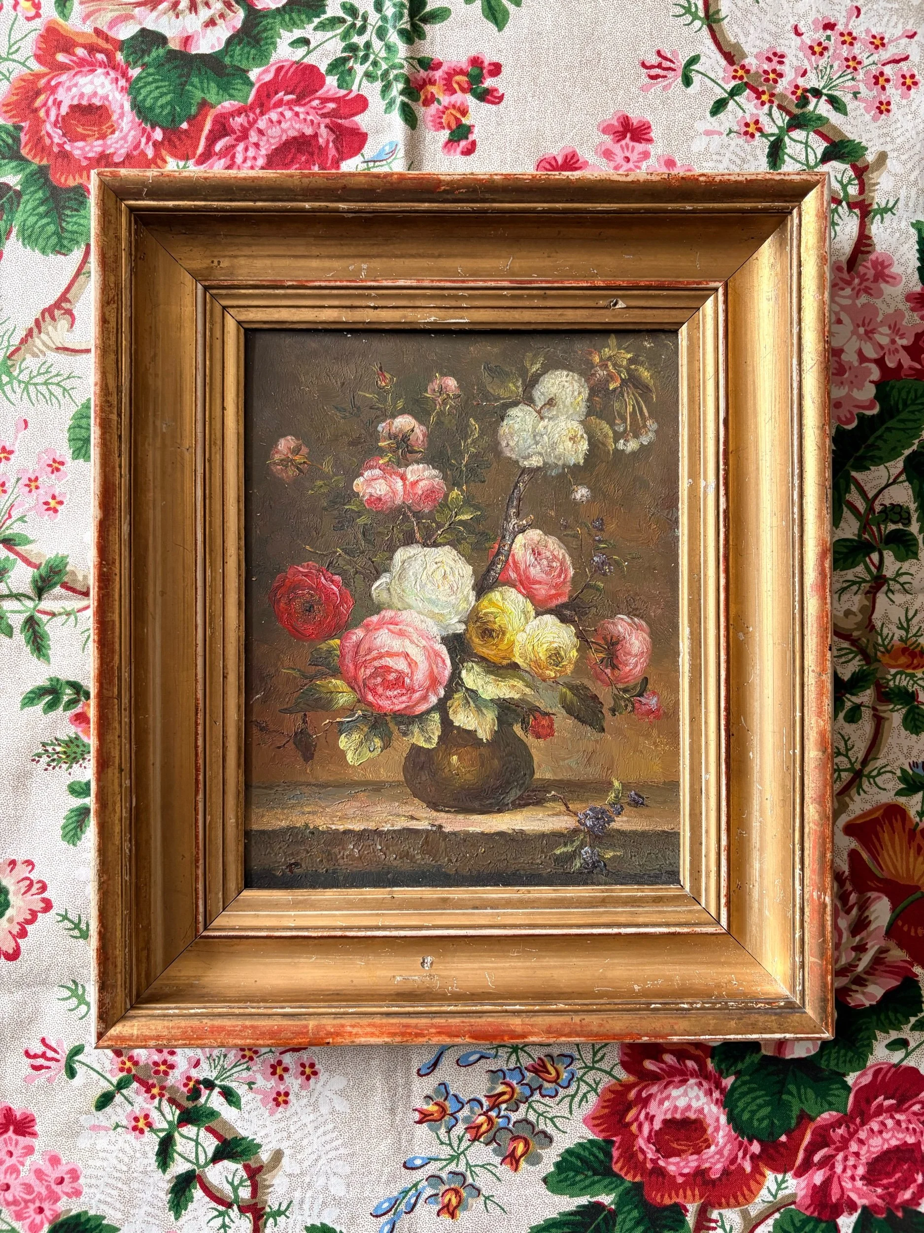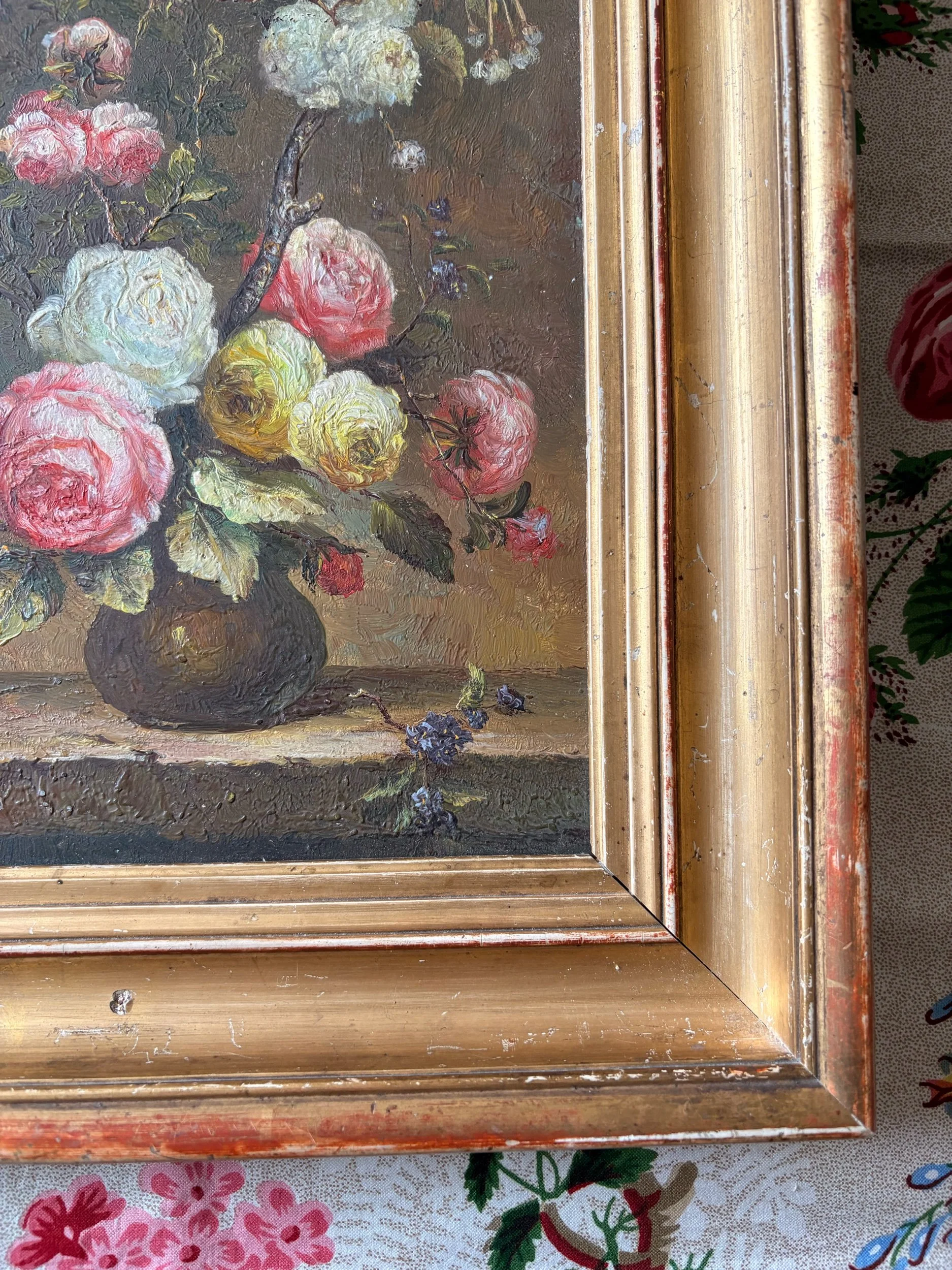 Shop Stuff › Oil painting of roses Image 1 of 5 Image 2 of 5 Image 3 of 5 Image 4 of 5 Image 5 of 5 Oil painting of roses £225.00 Charming antique oil painting on board in a beautiful, deep, carved and gilded antique frame34.5cm x 29cm Add To Cart Added! Charming antique oil painting on board in a beautiful, deep, carved and gilded antique frame34.5cm x 29cm