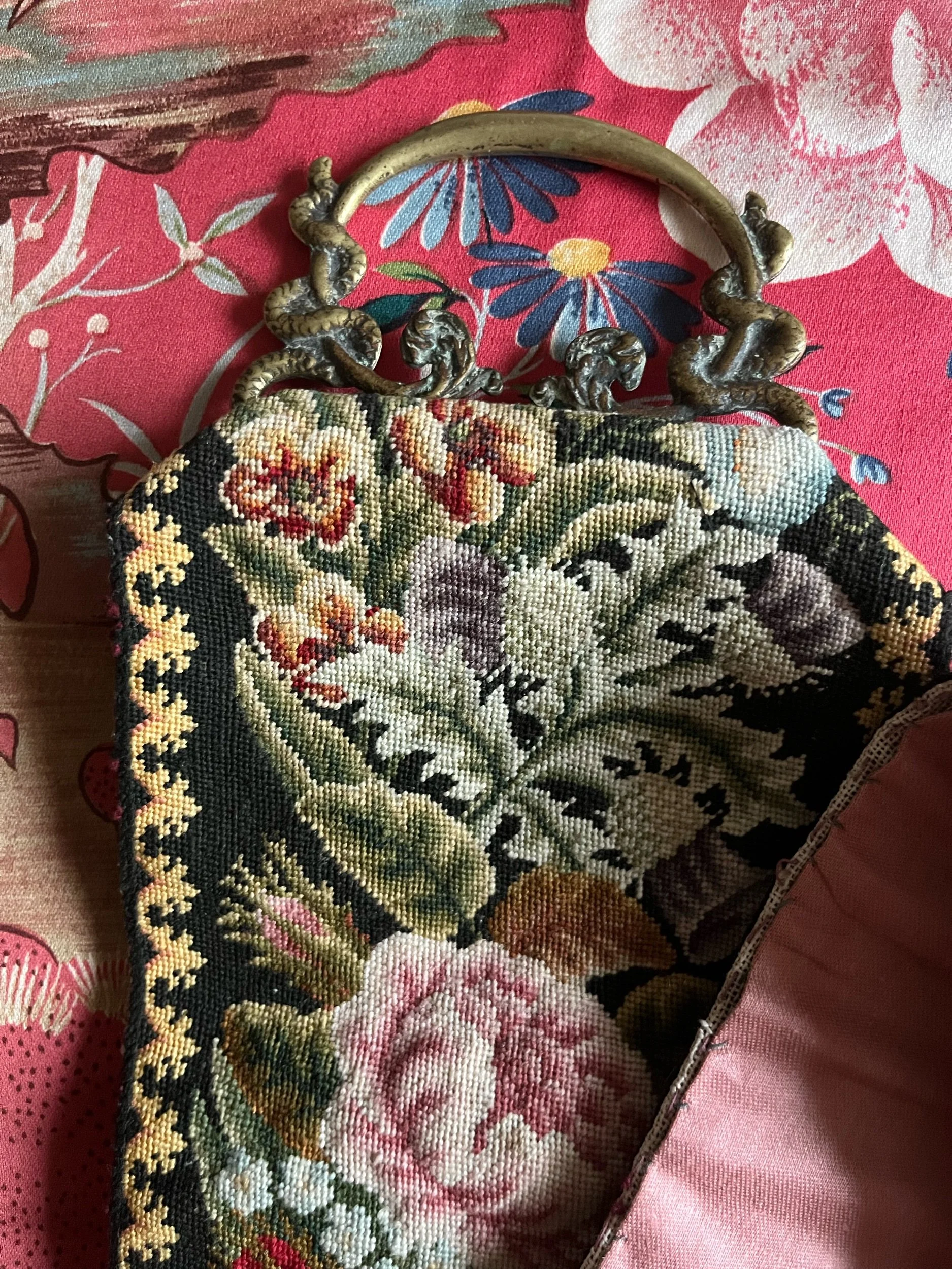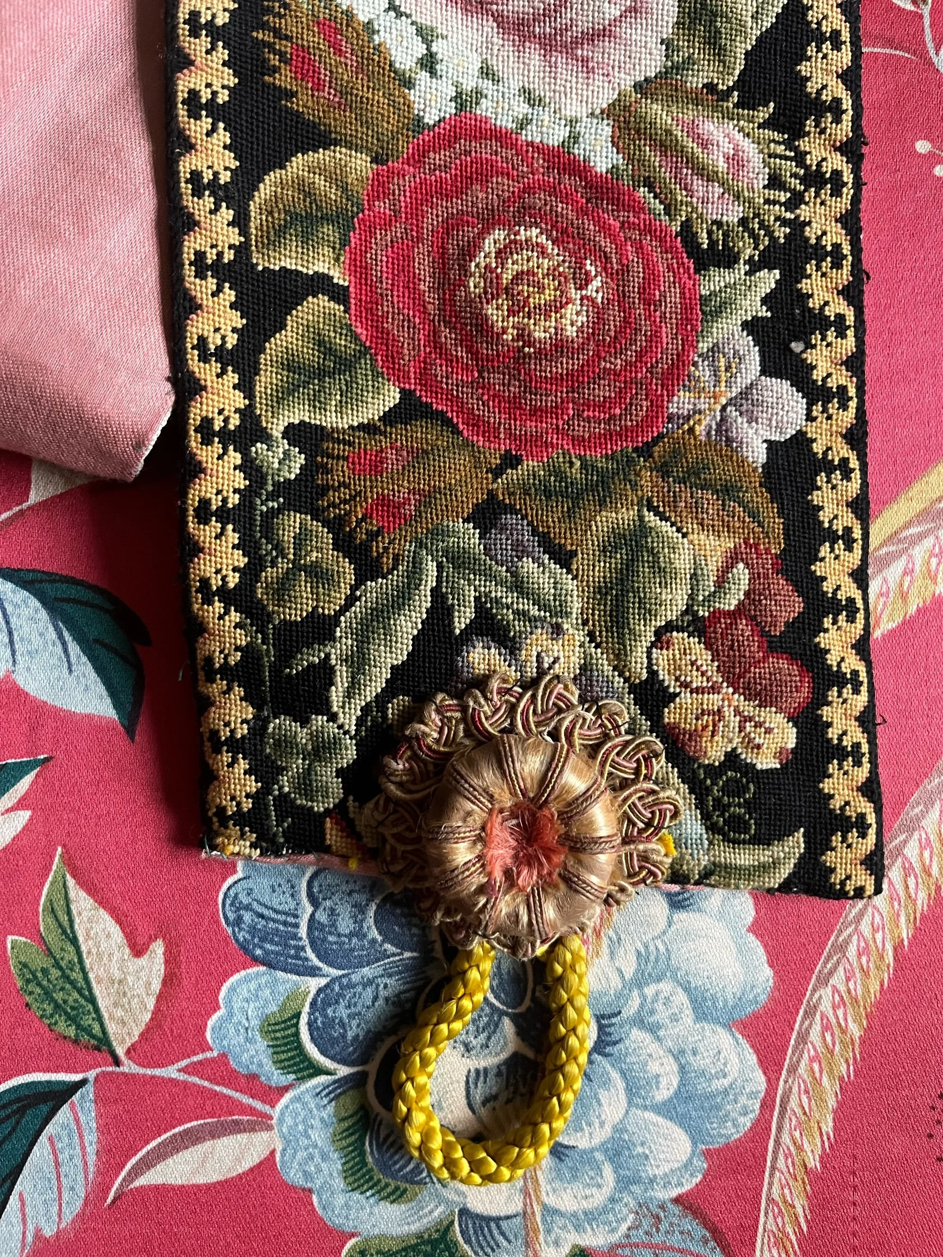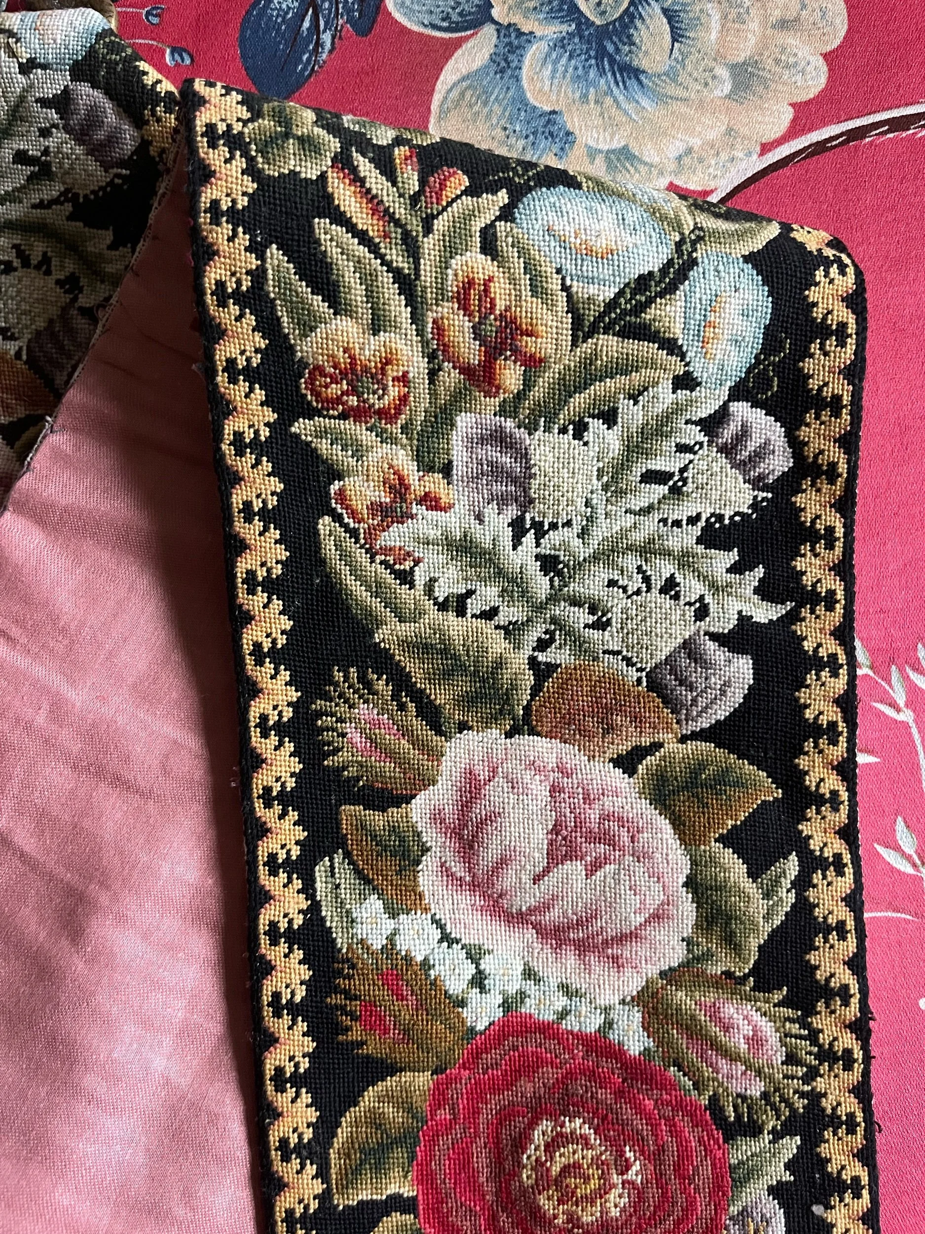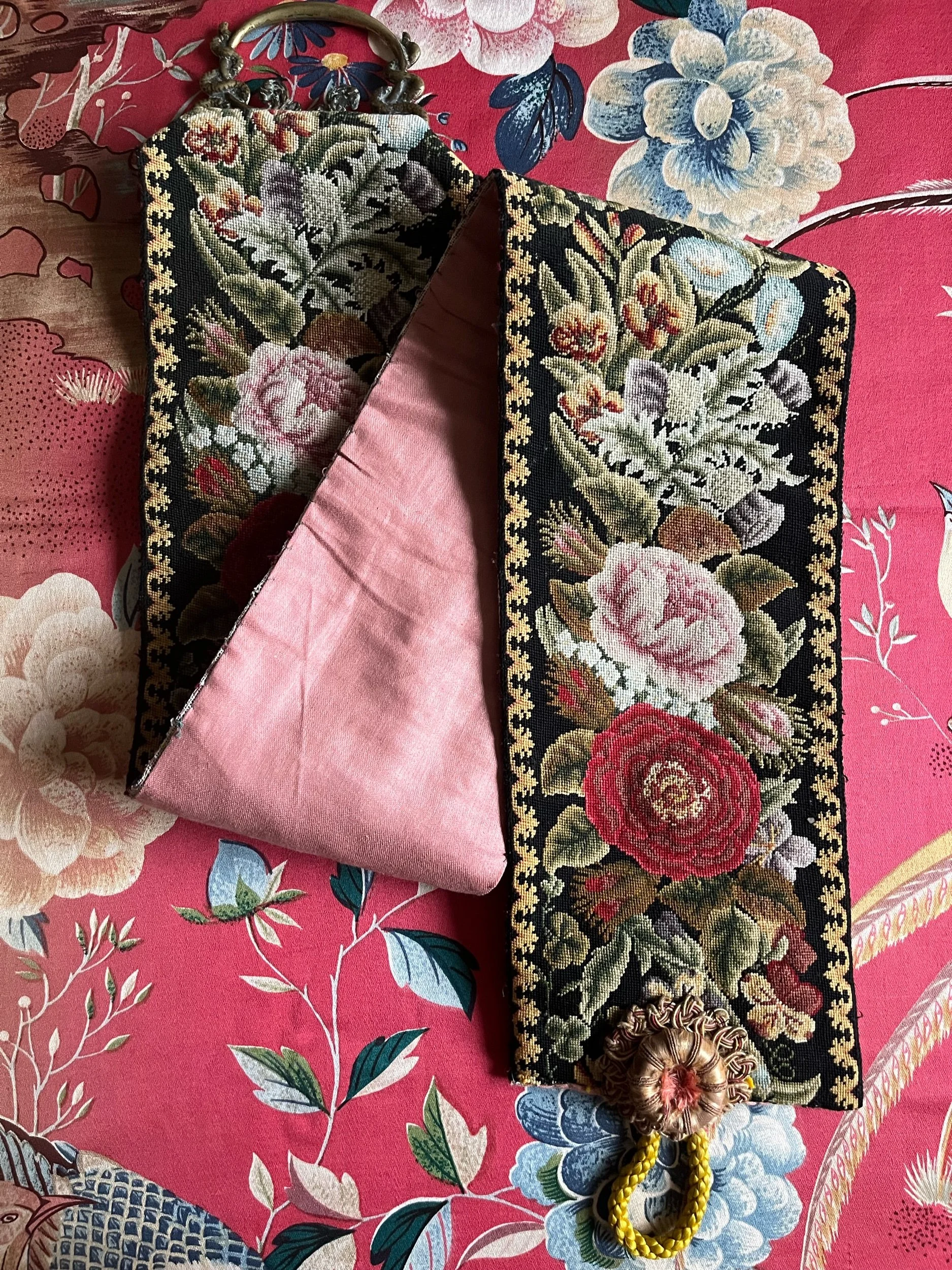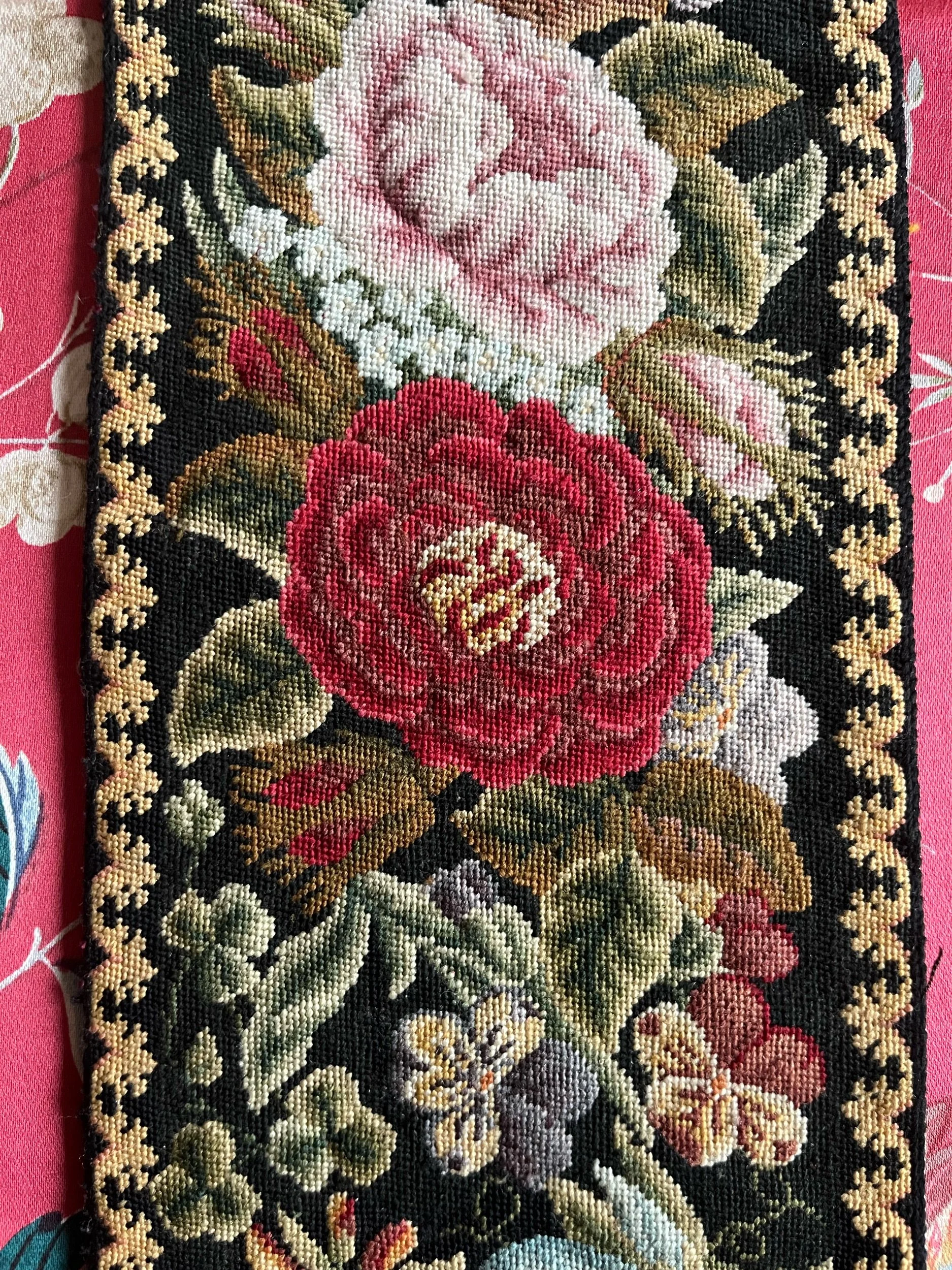 Antique bell pull with gilt metal handle in the most beautiful petit-point embroidery of roses, violas, thistles, clover leaves, morning glory, forget-me-nots and wallflowers