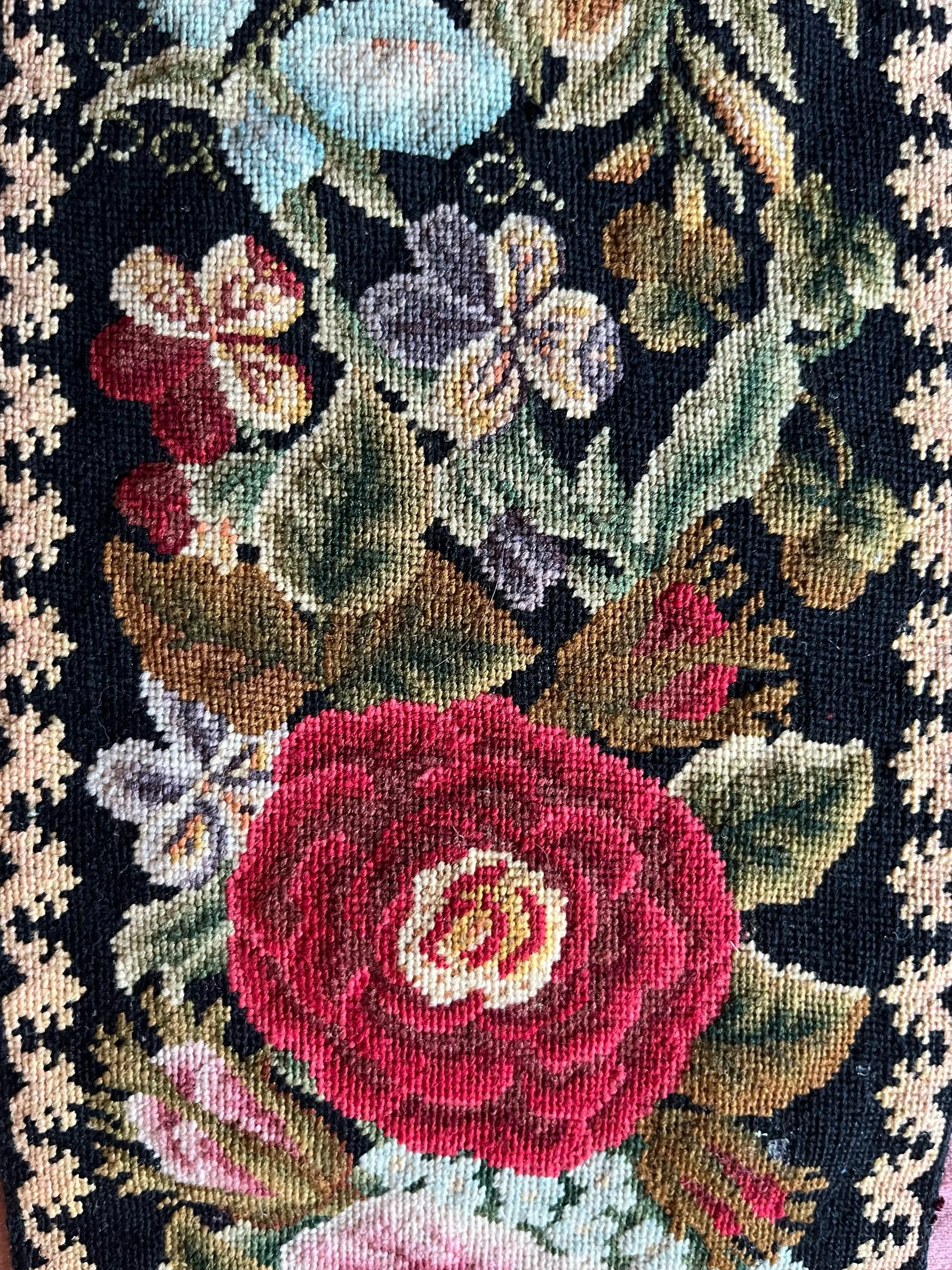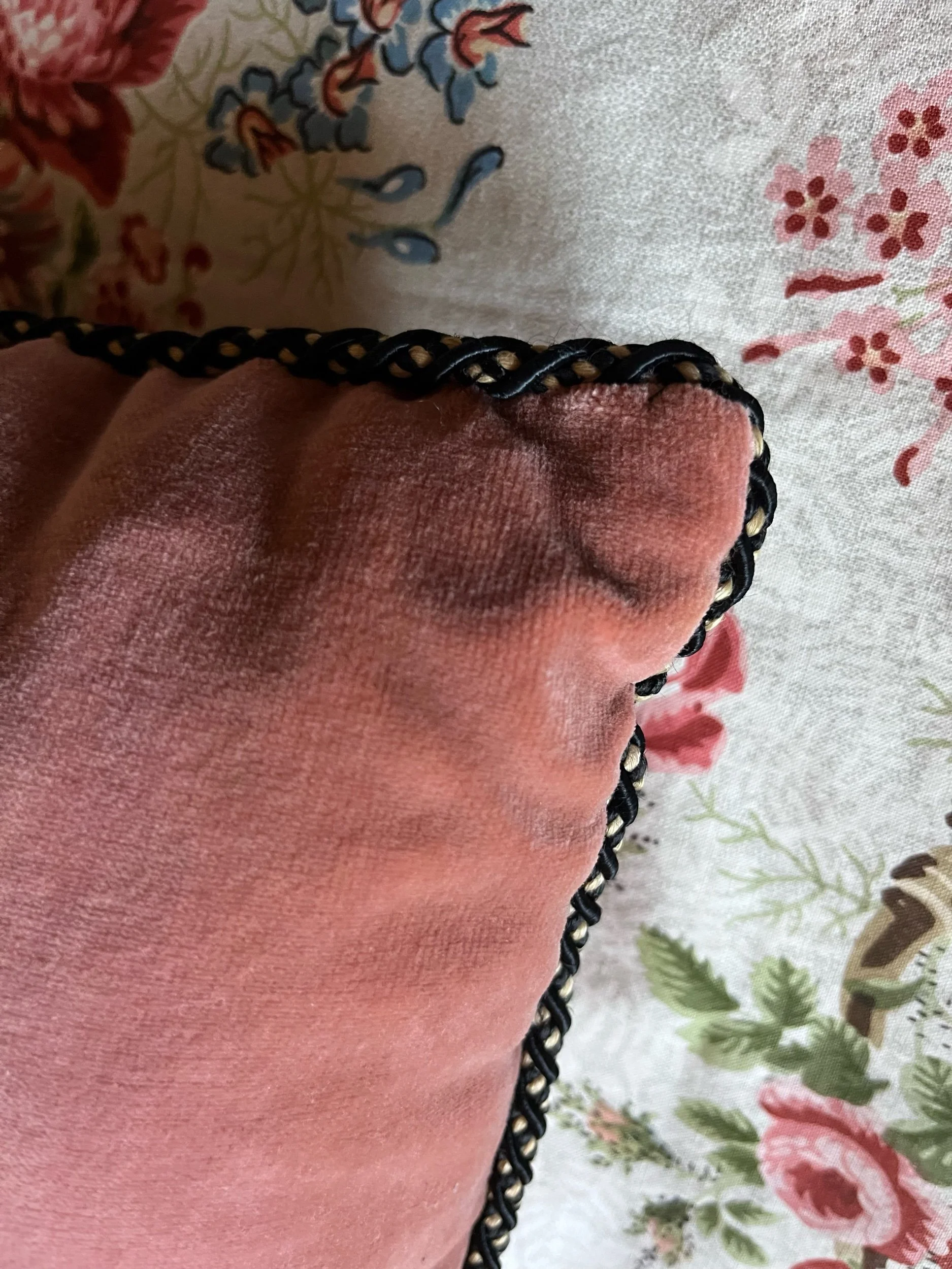 One of two cushions in antique pink velvet with matching strips of the prettiest appliquéd antique petit-point embroidery, antique silk braid and feather pads