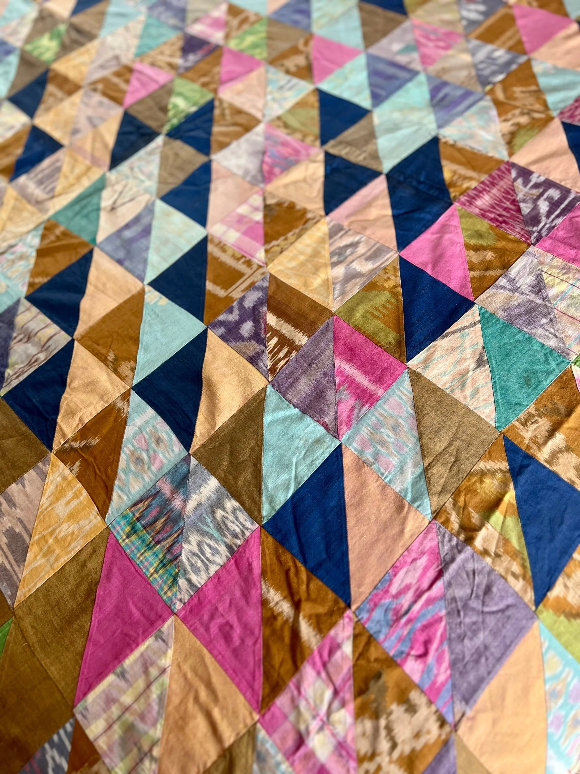 Hand stitched quilt or wall hanging made from fragments of vintage and antique kimono silk, backed with heavy cotton. Please get in touch for further images.