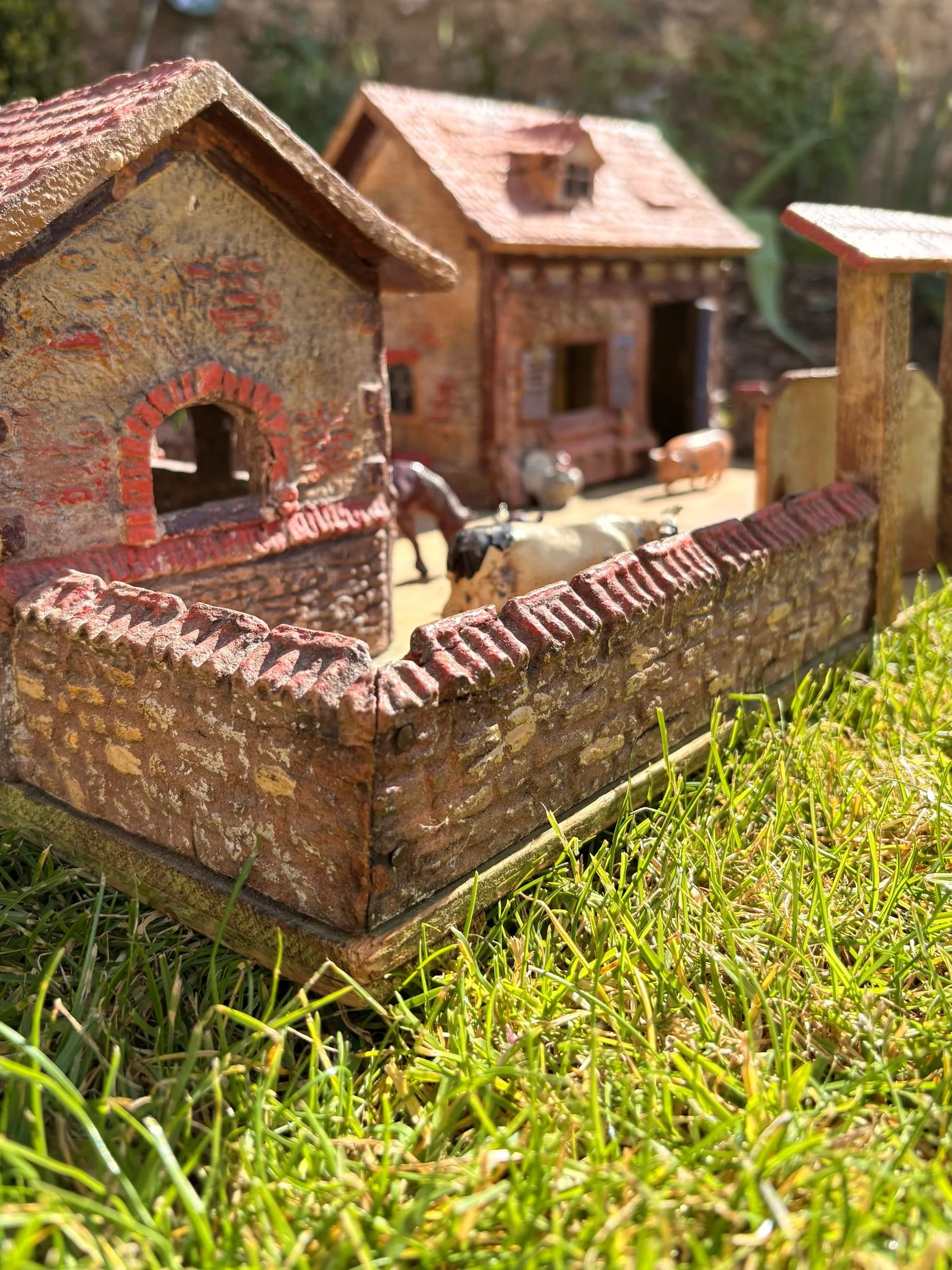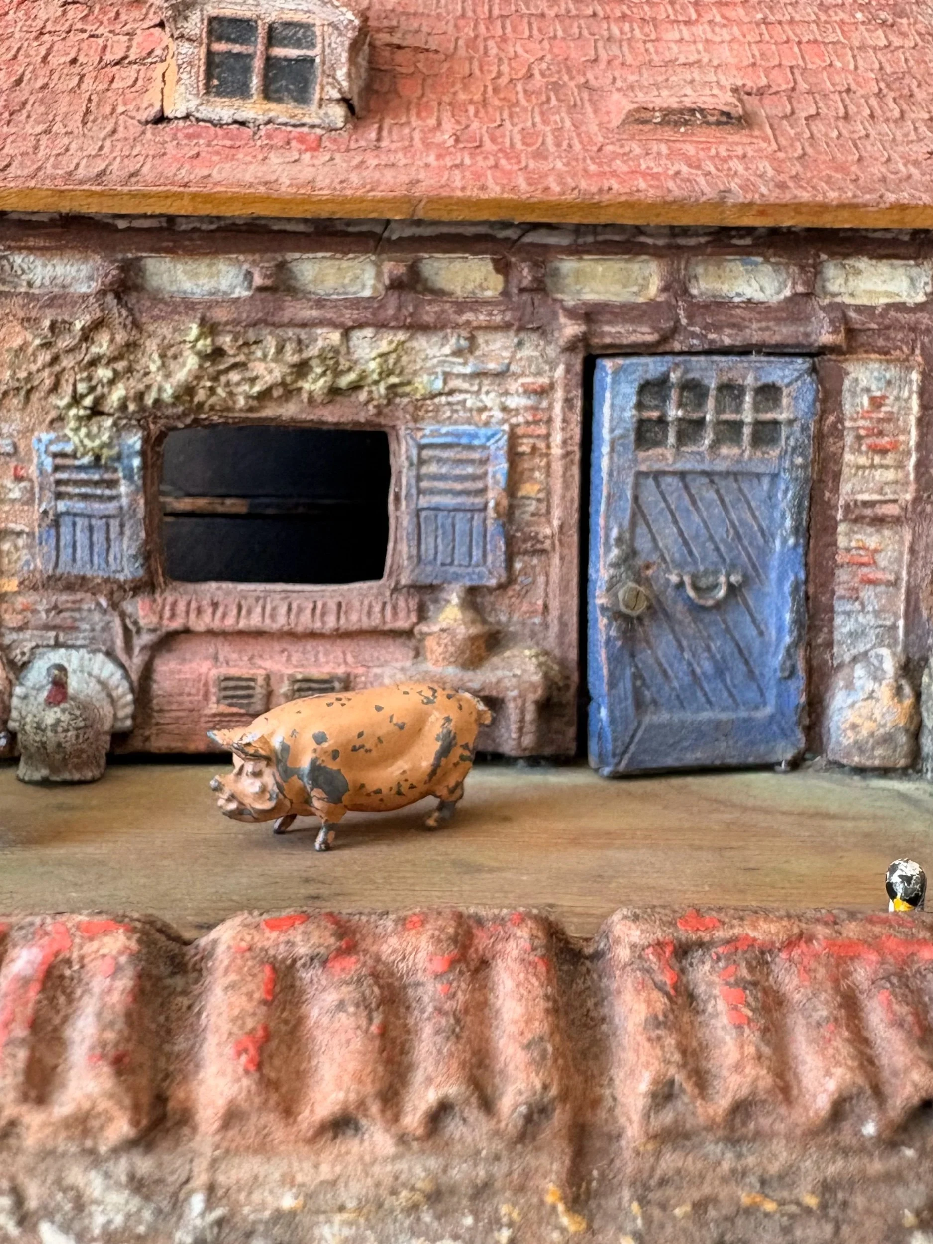 Wonderful vintage toy farm, with vintage metal farm animals comprising two standing cows, two sitting cows, a pig, a horse, a turkey, a goose, and a swan swimming on a mirror pond. Lovely details, from the pantiles to the lantern hung outside the barn door