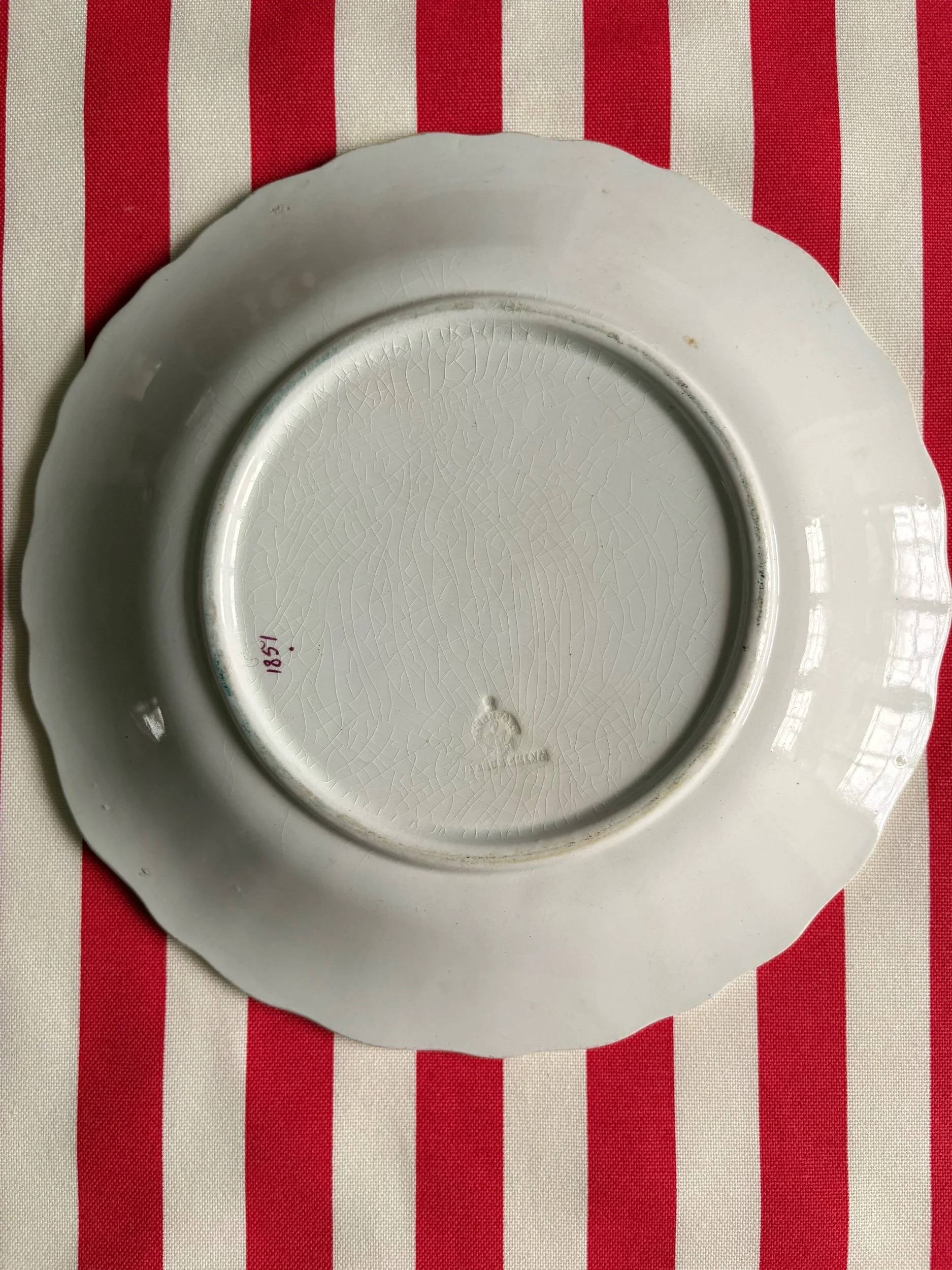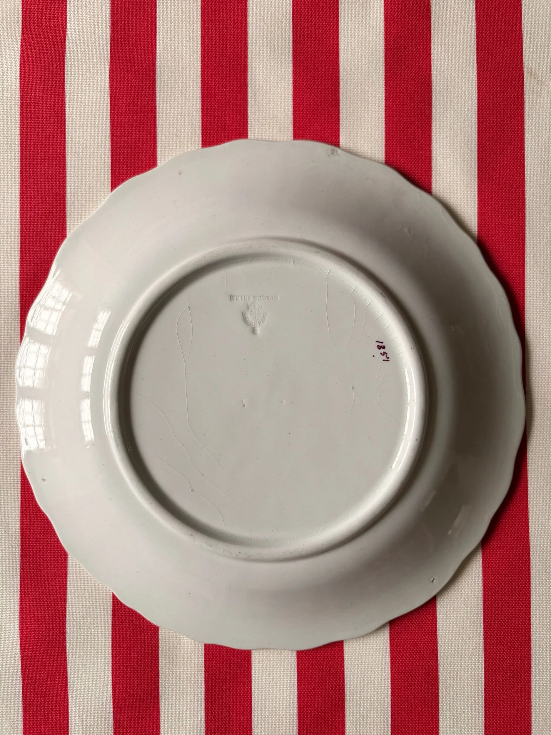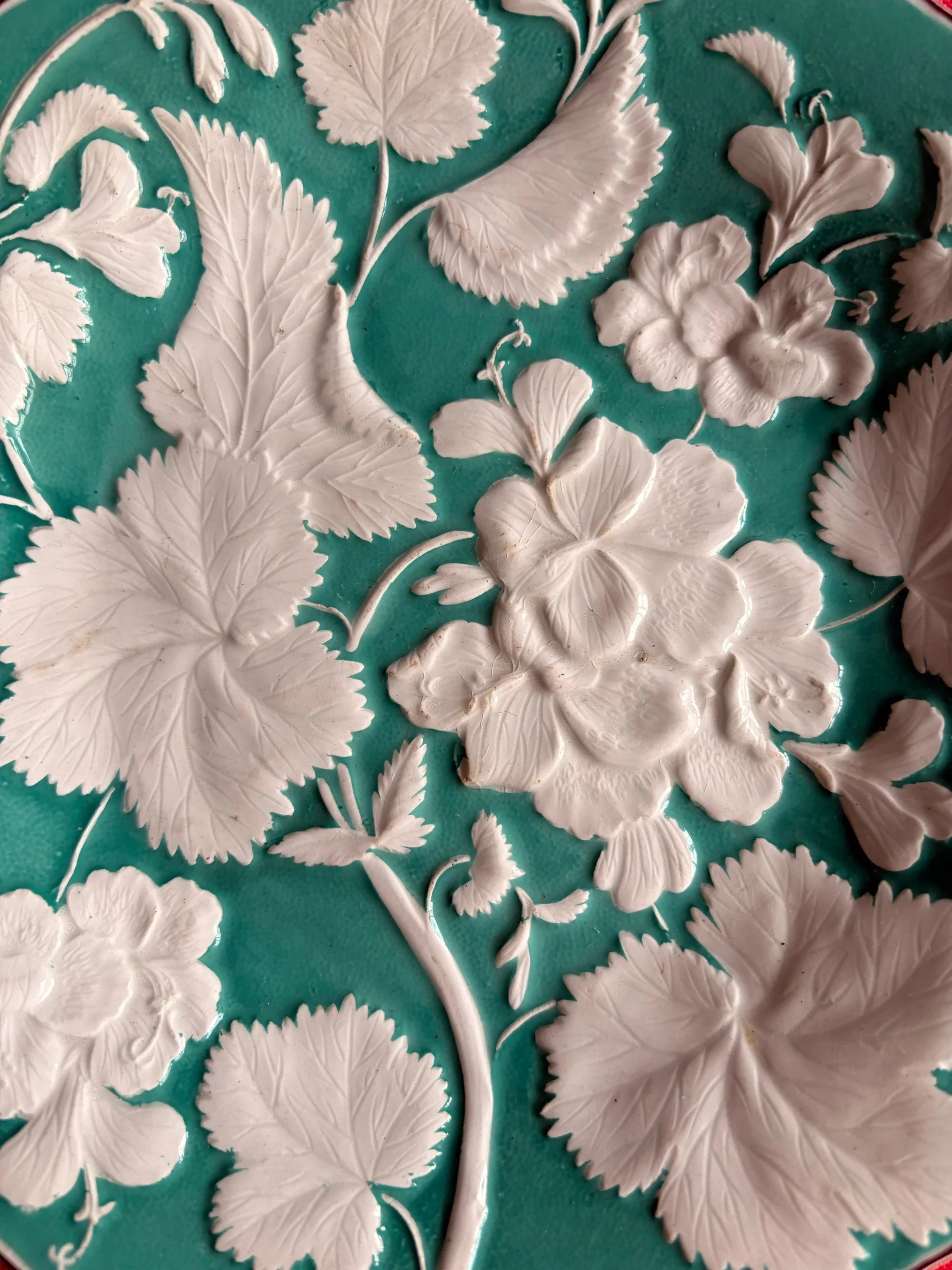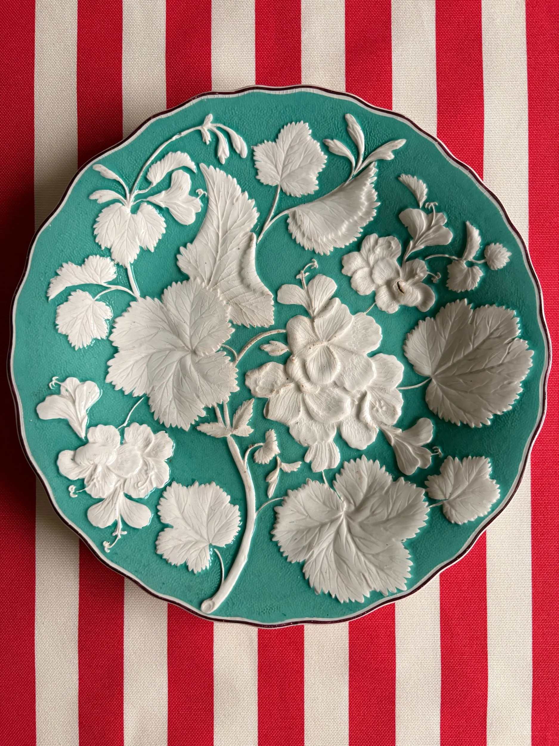 A pair of early 19th century Davenport plates with gorgeous moulded geranium decoration - a couple of very small and superficial chips, as shown