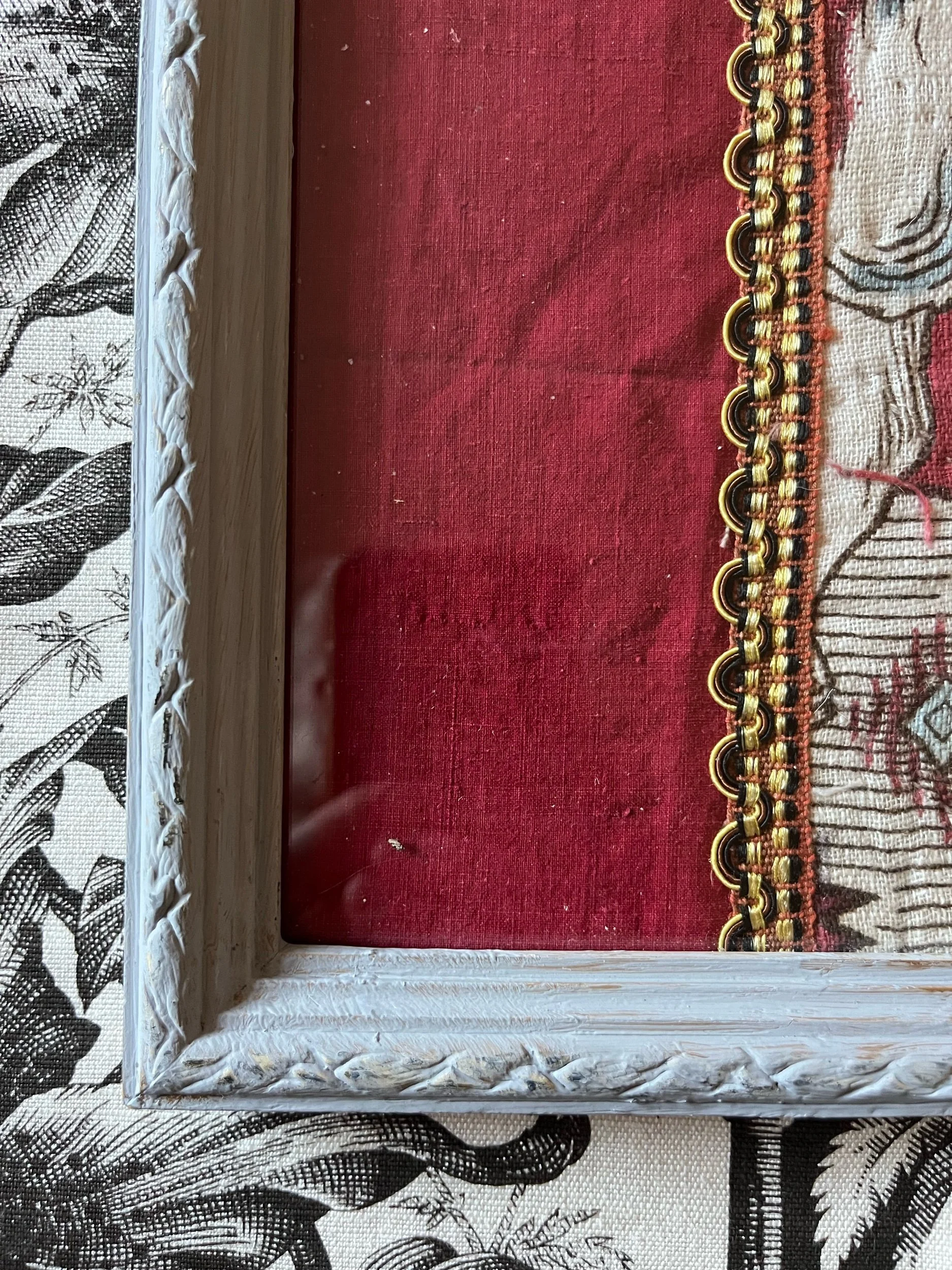 A framed piece of early 18th century ‘pencilled’ toile (the blue was painted in) mounted on antique cotton and bordered with antique braid