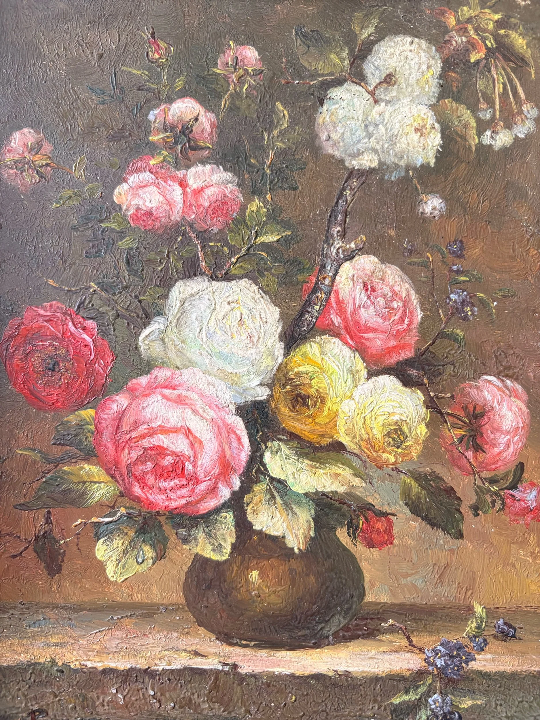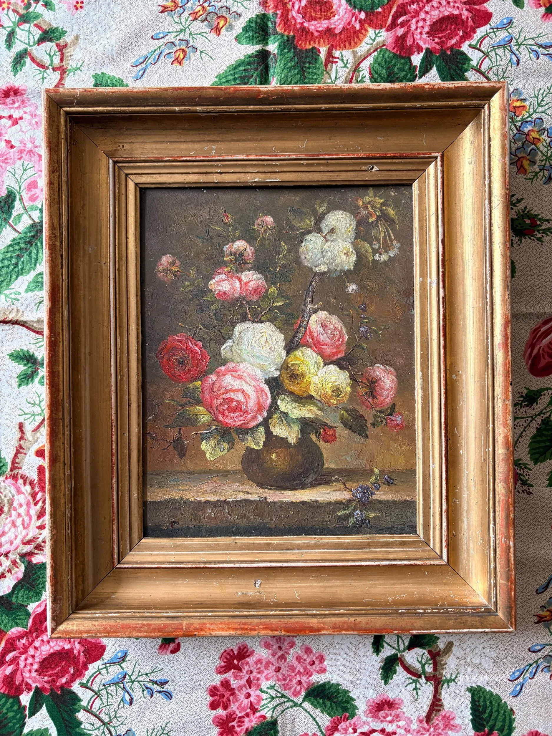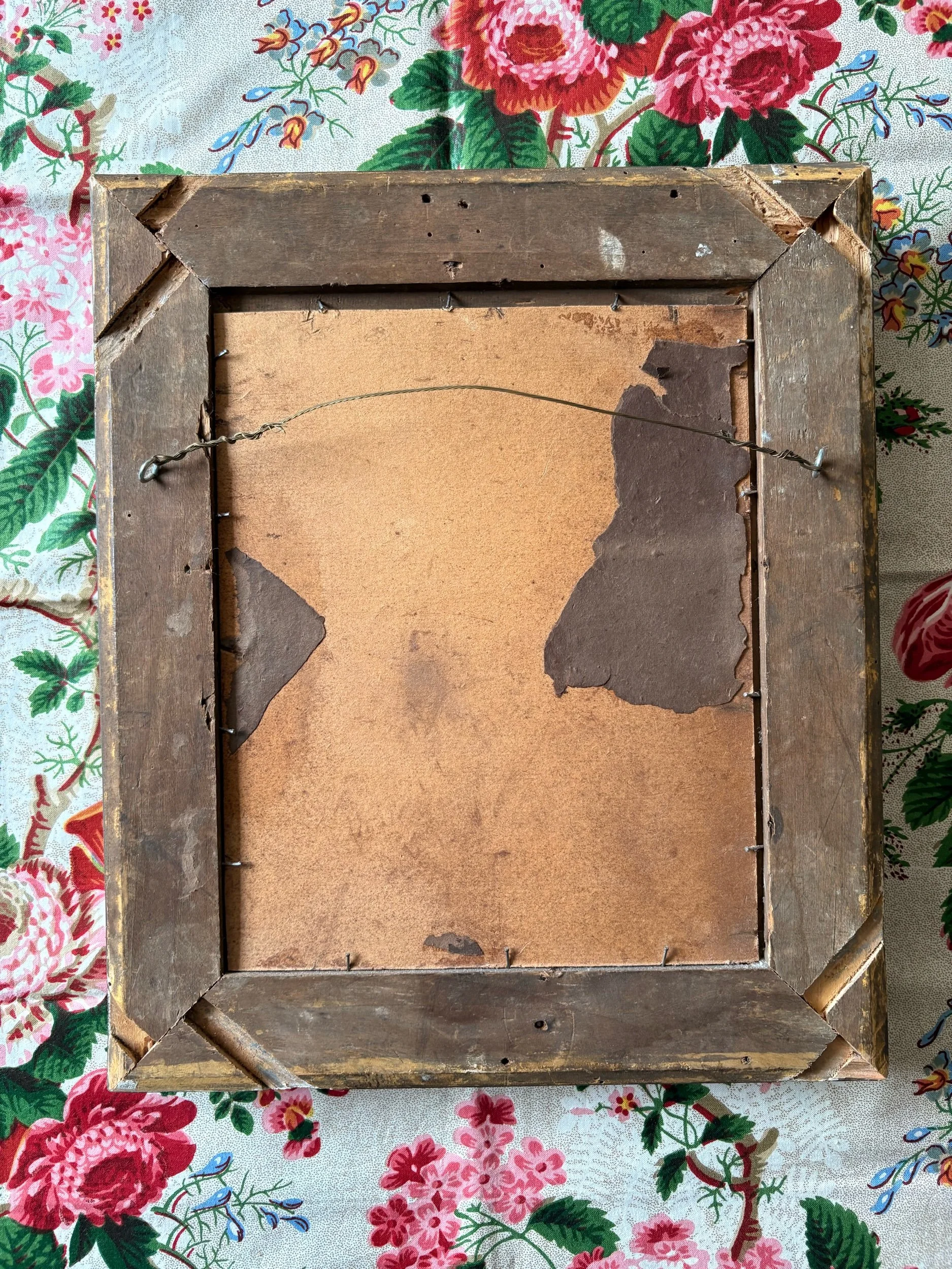 Charming antique oil painting on board in a beautiful, deep, carved and gilded antique frame